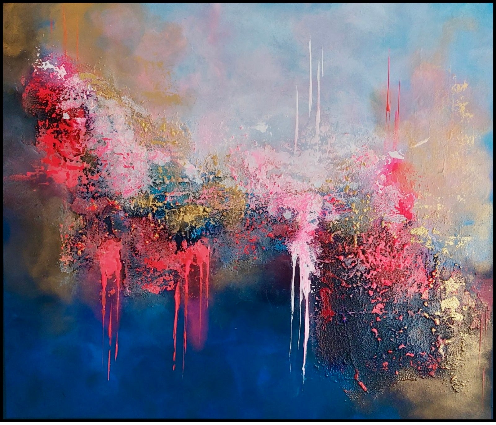 Fris met accenten van fel (neon) roze en goud. 3D doek met geschilderde lijst.