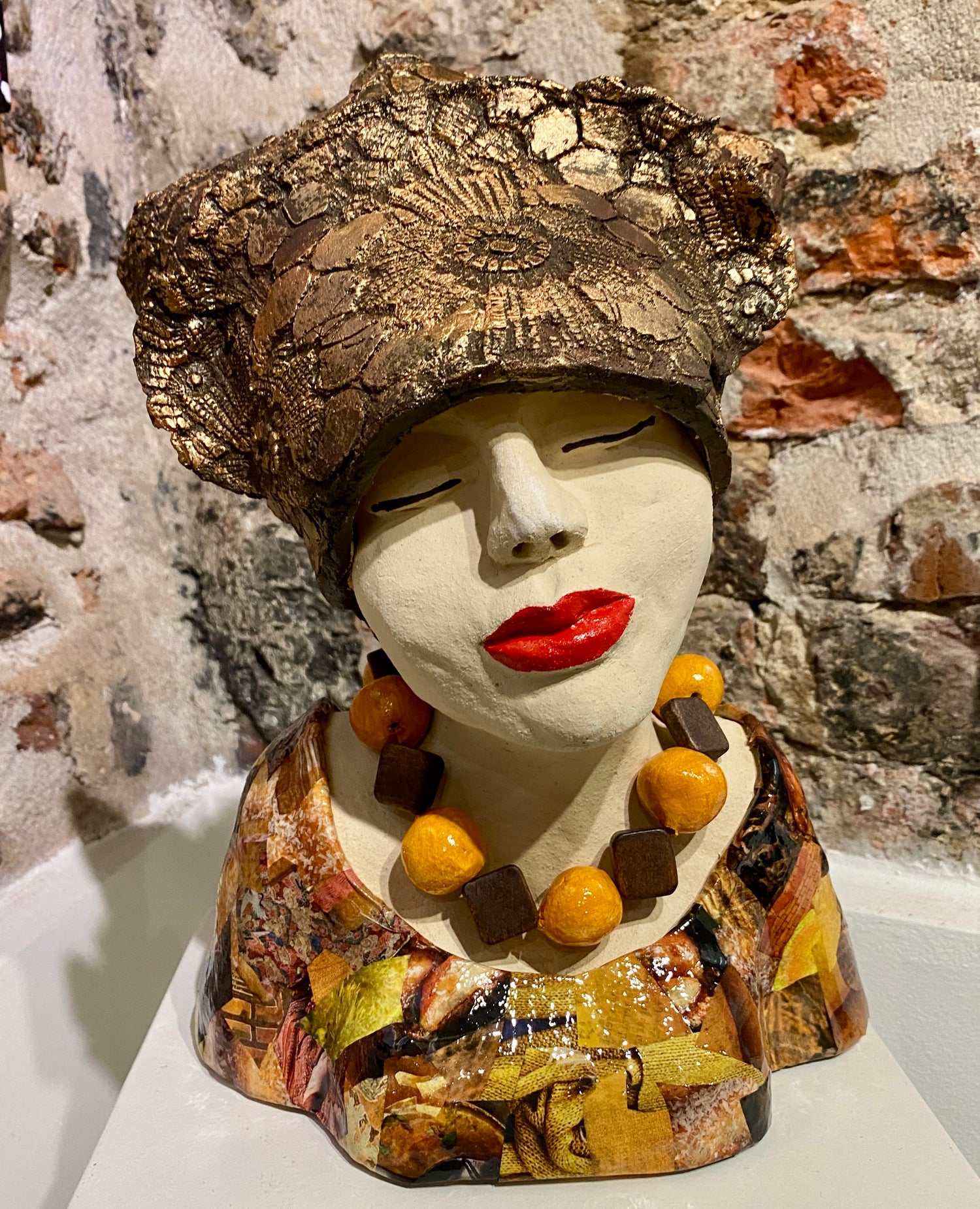Een grote rode keramieken sculptuur van Jeannie Hoovers met papiermozaiek, een rode hoed, handgemaakte kralenketting en Jeannie Hoovers kenmerk: volle rode lippen. Beeld is uniek.