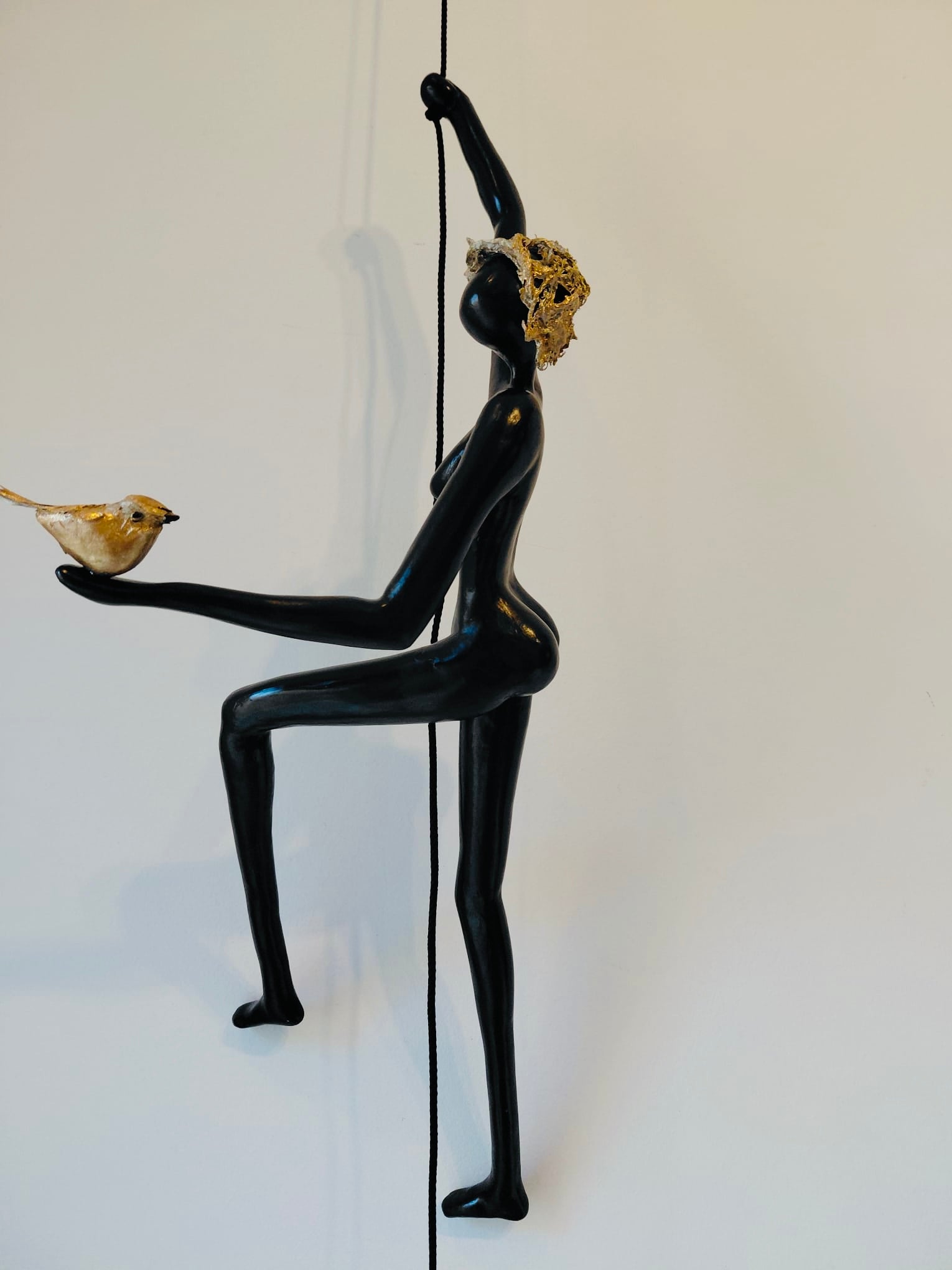 Geveltoeriste met goud hoedje en vogeltje aan klimkoord