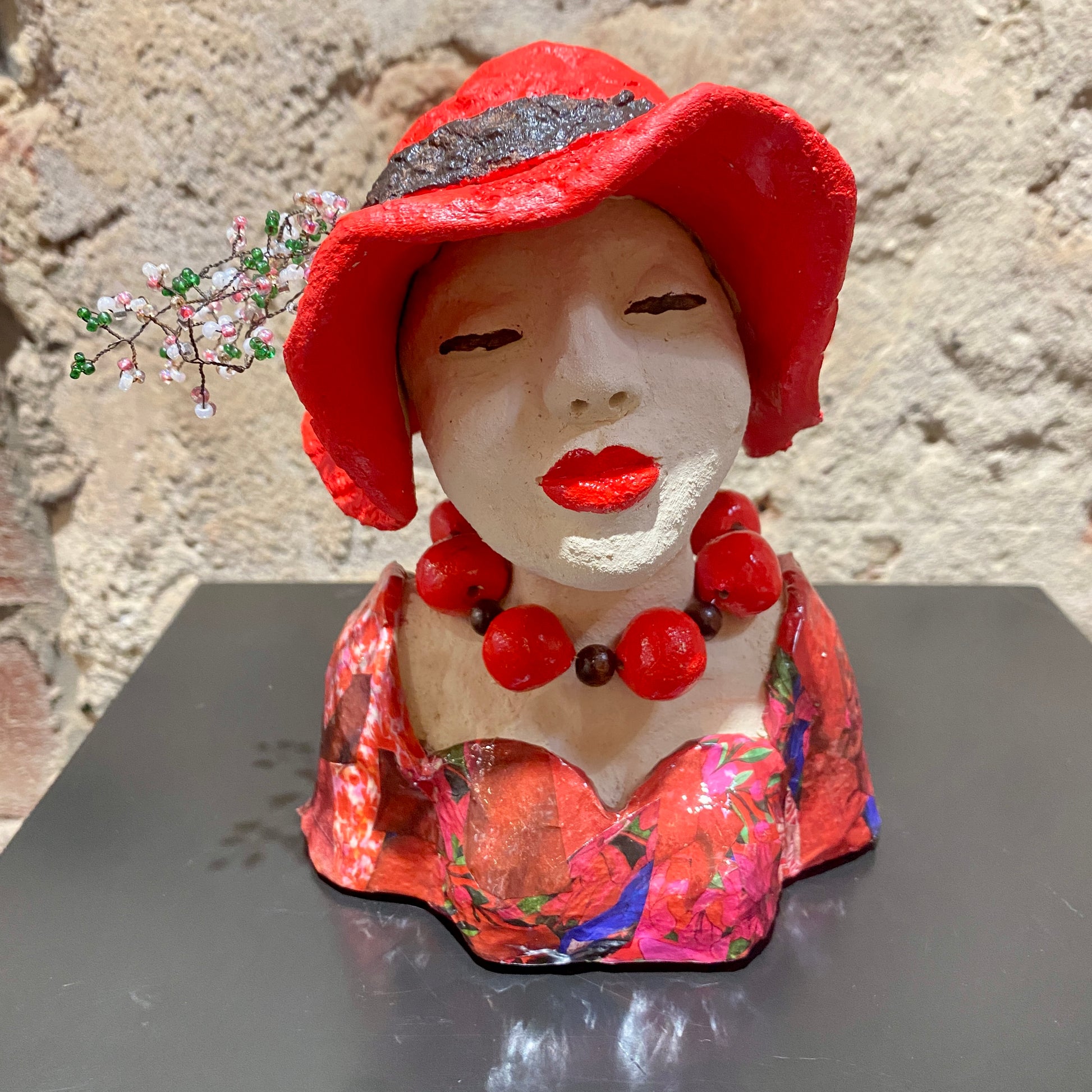 Een keramieken sculptuur van Jeannie Hoovers met rode papiermozaiek, een rood/zwart hoedje, handgemaakte kralenketting en Jeannie Hoovers kenmerk: volle rode lippen. Beeld is uniek.
