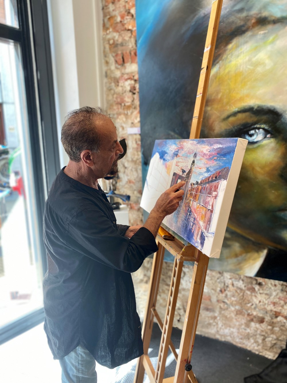 Farzad heeft een geheel eigen stijl en werkt zonder penseel, met olieverf uit de tube en met paletmes.